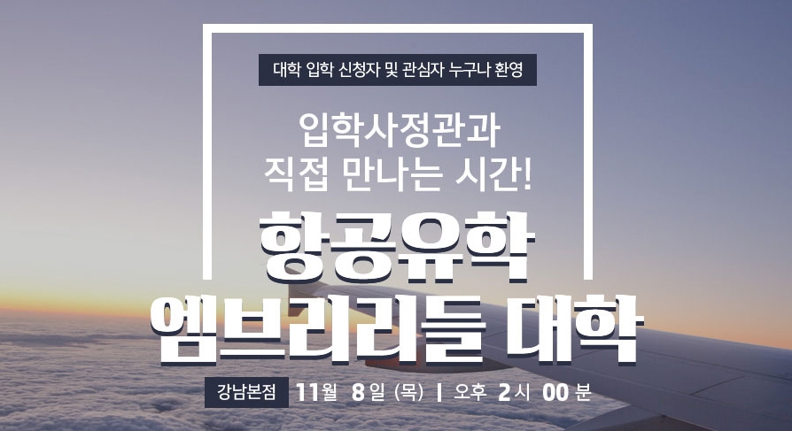 11월 8일(목) 오후 2시 강남본점에서 미국 최고의 항공대학 엠브리리들 입학사정관과 만날 수 있는 시간을준비했습니다