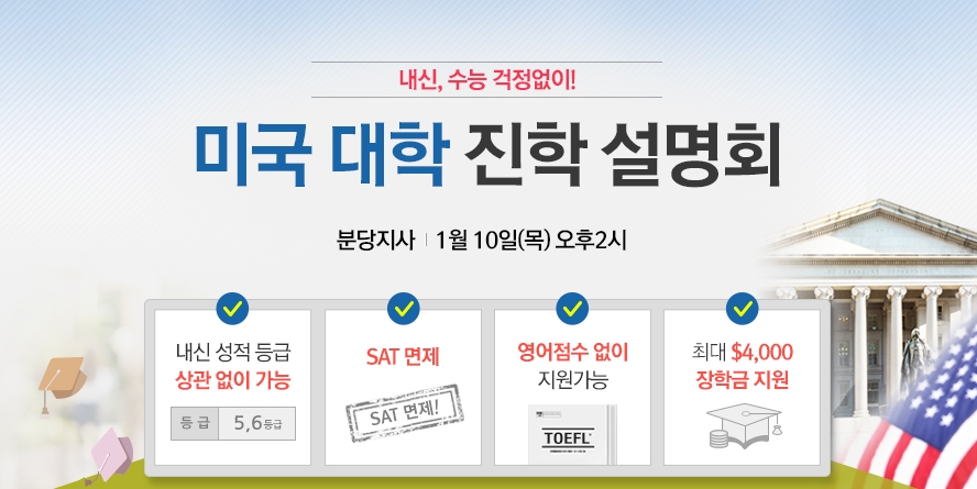 분당지사에서는 1월 10일(목) 오후2시 "미국 명문대 진학 설명회"을 진행한다