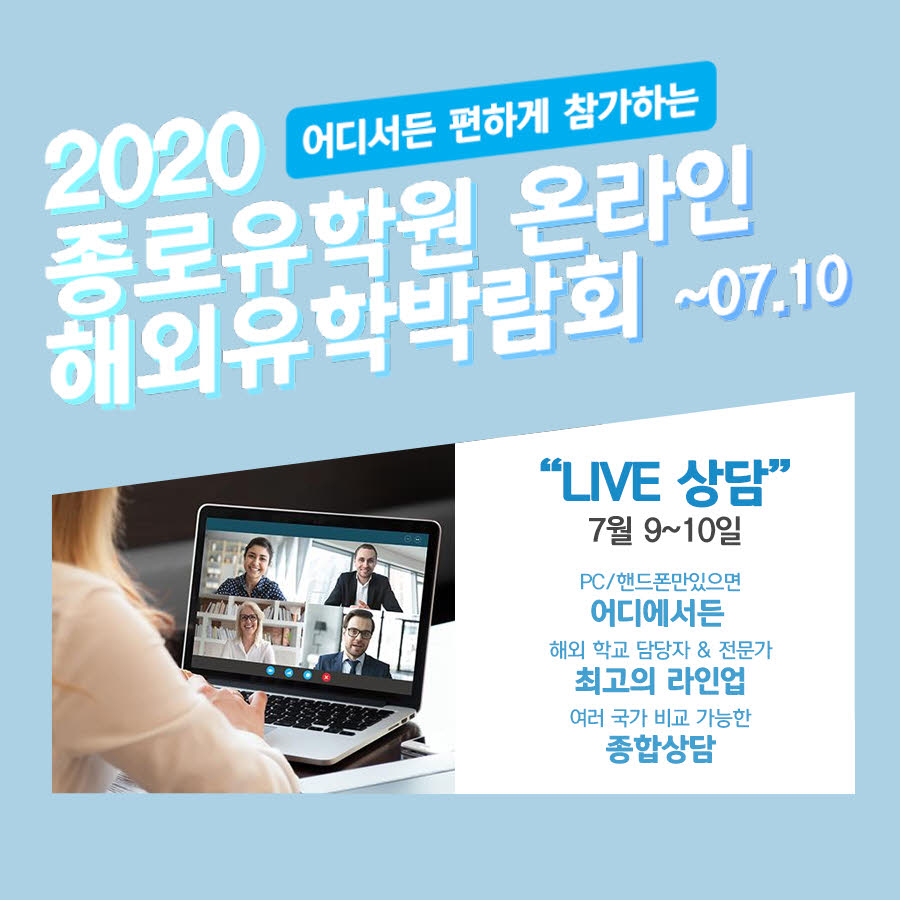 해외 대학교와 대학원, 어학연수, 조기유학 등의 유학의 최신 트렌드와 정확한 정보 전달하고 다양한 혜택을 제공함으로써, 해외 유학을 준비하는 학생들에게 필수 코스였던 종로유학원의 해외유학박람회가 올해는 정부의 사회적 거리두기 실천을 위해 온라인 언텍트로 개최된다.