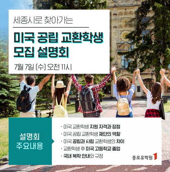 [잡포스트] 박순철 기자 = 종로유학원이 7월 7일 세종시에서 '미국 공립 교환학생 모집 설명회'를 진행한다고 밝혔다.