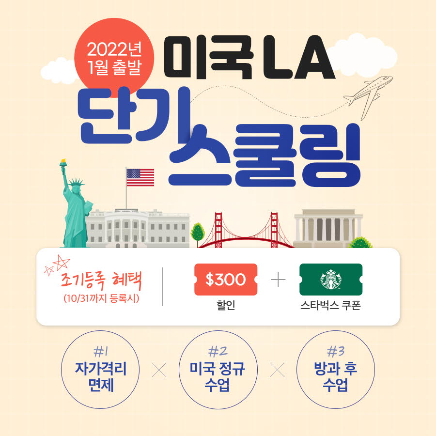 위드코로나로, 해외 단기 스쿨링에대한 관심이 부쩍 늘고 있다. 이에 종로유학원에서는 미국 서부 단기 스쿨링을 개최하여 미국 학생들과 함께 정규 수업과 액티비티 그리고 부족한 영어를 보충해주는 방과 후 수업까지 진행한다.