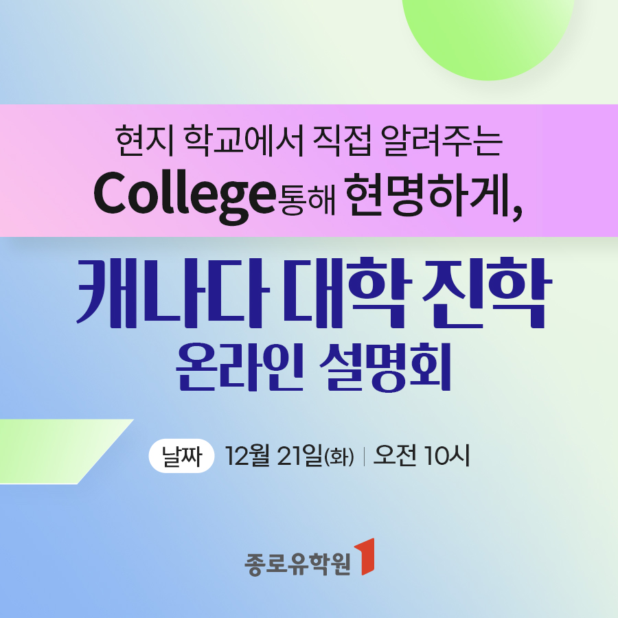 대한민국 대표 유학기업 종로유학원은 캐나다 유학을 준비하는 이들을 위해 12월 21일 10시에 "캐나다 대학 진학 설명회"를 온라인으로 진행한다. 이번 설명회는 컬리지 후 UT, UBC, 사이먼 프레이저 대학(SFU) 편입 방법을 소개한다. 또한, 성공적인 캐나다 대학 진학 사례와 문과에서 이과로 진학하는 등 다양한 전공 선택이 가능한 유학 전략을 제시할 예정이다.