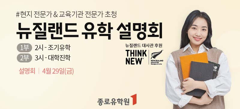 이러한 관심을 반영, 뉴질랜드 교육진흥원 인증의 종로유학원은 뉴질랜드 유학에 관심 있는 이들을 위해 설명회를 기획했다고 전했다. 4월 29일 2시에는 조기유학, 3시는 대학진학에 대한 설명회를 종로유학원 강남본점에서 순차적으로 열고, 현장 참여가 어려운 학생·학부모를 위해 온라인으로 동시에 진행된다.