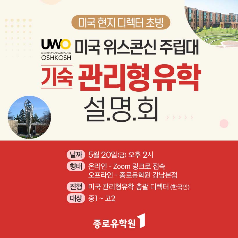 미국 관리형유학 프로그램을 전문으로 하는 종로유학원에서 2022년 8월에 출발하는 미국 위스콘신 주립대학교 기숙 관리형 유학 설명회를 개최한다.