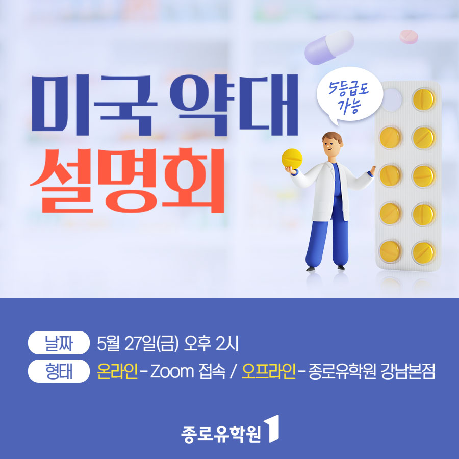 2022학년부터 국내 약대가 모두 6년제로 전환하고, 절반 이상이 수시로 선발되고 있어 입학의 문이 더욱 좁아졌다. 반면, 한국에서의 내신성적이 다소 낮아도 미국 약대로 입학이 가능하여, 약사의 꿈을 가진 학생과 학부모의 주목을 받고있다. 이러한 변화에 발맞춰, 종로유학원에서 미국 약대 설명회를 5월 27일 2시에 서울 강남 본점에서 오프라인과 온라인 동시에 진행할 예정이다.