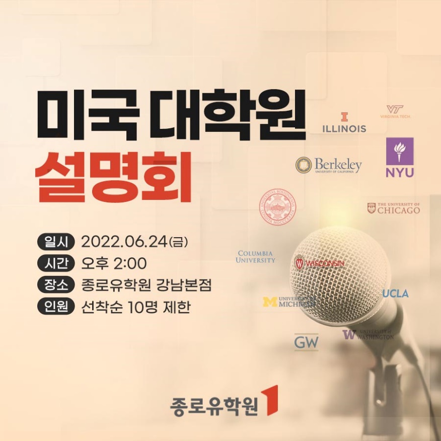 종로유학원에서 오는 6월 24일 오후 2시 서울 강남 본점에서 미국 대학원 입학 설명회를 진행한다고 밝혔다.