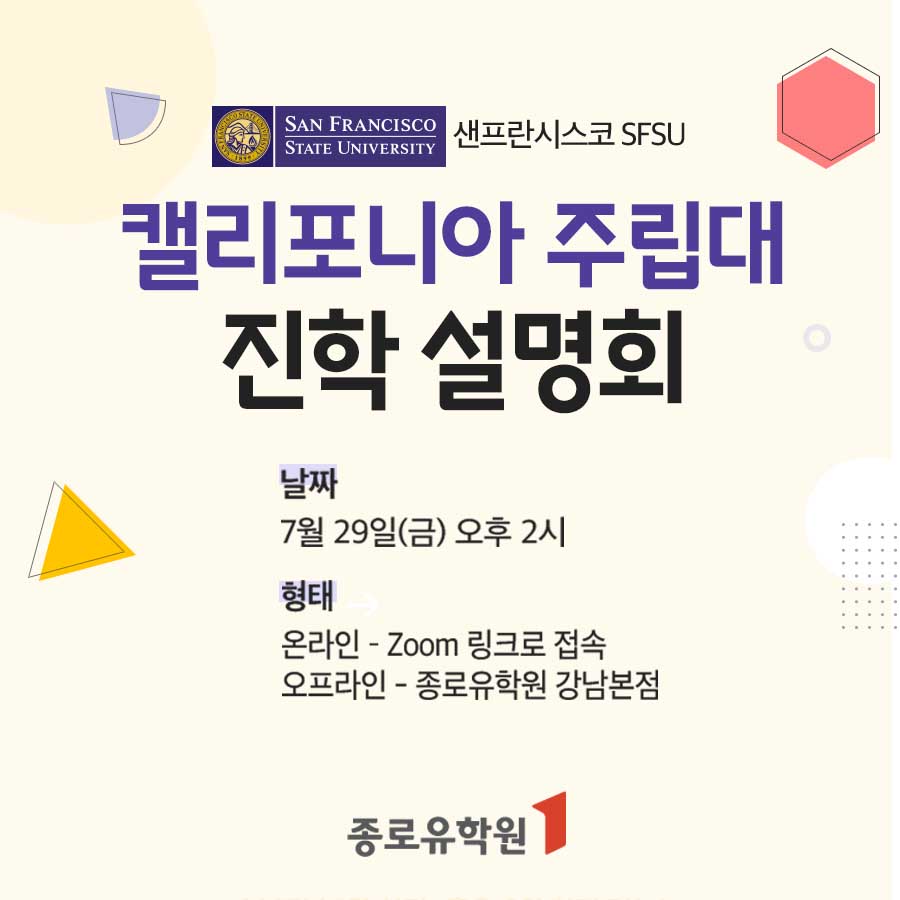 종로유학원에서 캘리포니아 주립대 (샌프란시스코 캠퍼스) 진학 설명회를 7월 29일 2시에 서울 강남 본점에서 오프라인과 온라인 동시에 진행할 예정이다. 본 설명회는 미국 대학을 준비하는 고등학교 2~3학년 학생과 반수 혹은 재수생 등 내신 걱정없이 주립대 진학을 원하는 학생과 학부모를 대상으로 정보를 제공한다.