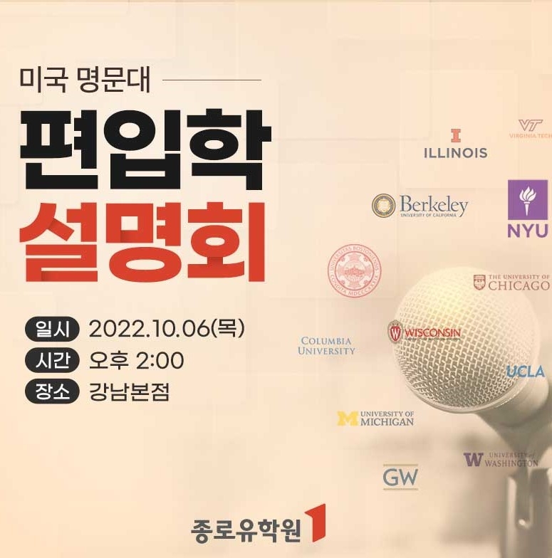 종로유학원에서 미국 편입학 설명회를 10월 6일 2시에 서울 강남 본점에서 진행할 예정이다. 본 설명회는 한국 대학이나 캐나다, 홍콩 등 해외대학에서 편입할 경우는 물론, 미국 2년제 대학에서 4년제로 또는 미국 4년제 대학에서 명문대로 편입할 경우나, 평생교육/학점은행제에서 미국 대학으로 편입을 희망하는 대상으로 정보를 제공한다.
