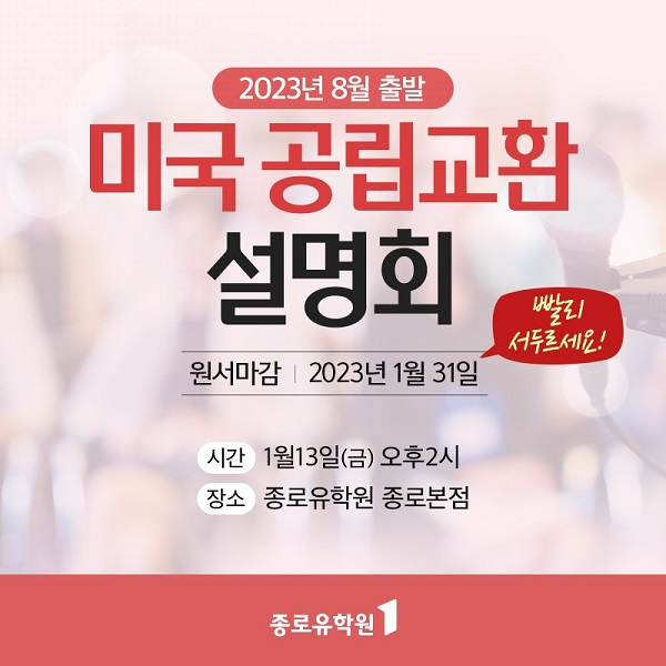 유학전문기업 종로유학원 종로본점에서 미국 공립교환 설명회를 1월 13일 2시에 진행한다고 밝혔다.