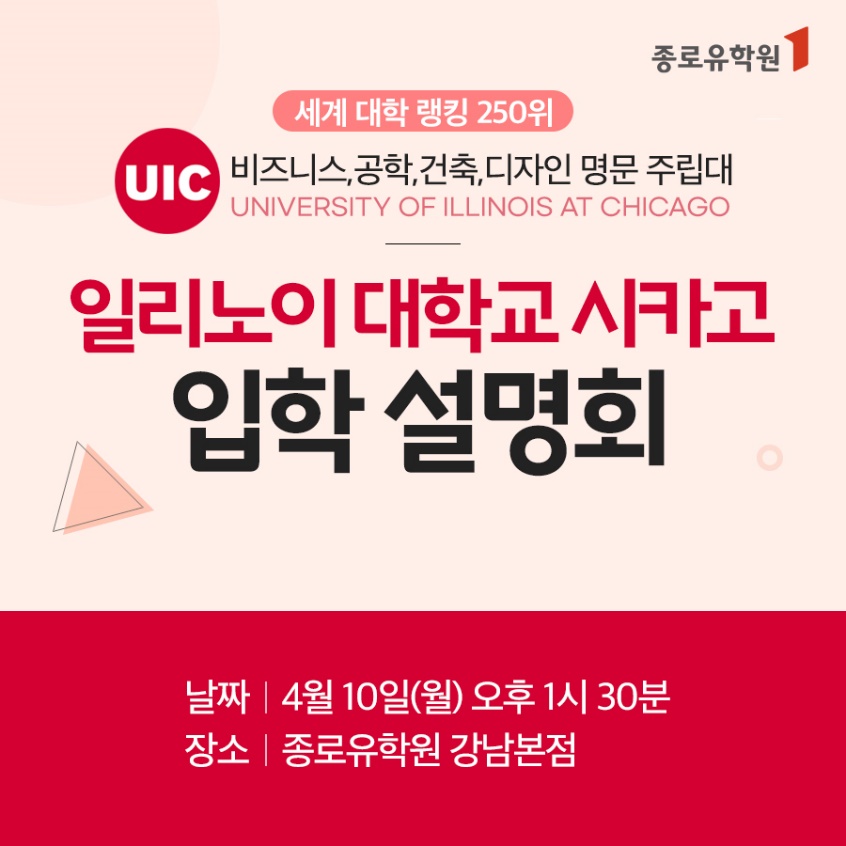 유학전문기업 종로유학원에서 일리노이 대학교 시카고 입학 설명회를 4월 10일에 서울 강남 본점에서 연다고 밝혔다. 입학 담당자가 직접 진행하는 본 설명회는 고등학교 3학년, 검정고시생, 반수 혹은 재수생으로 해외대학을 고려하거나, 내신 걱정없이 미국 주립대 진학을 원하는 학생 및 학부모를 대상으로 정보를 제공한다.