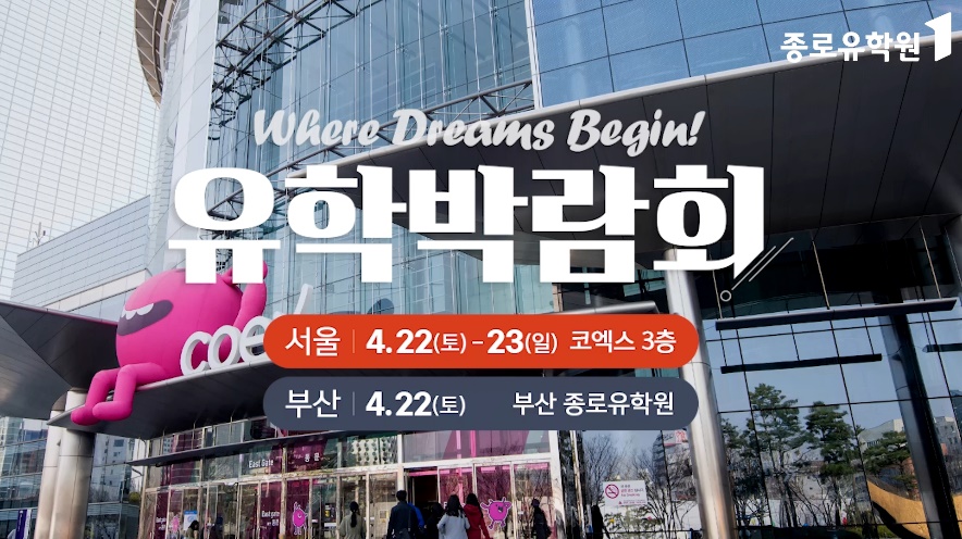 41년 전통의유학 전문 기업 종로유학원이 2023년 해외유학박람회를 오는 4월서울과 부산지역에서 개최한다고 밝혔다. 4월 22일(토)부터 23일(일)까지 양일간 서울 코엑스 3층에서열리고, 22일에는 부산 서면 에이원프라자 10층에서 열릴예정이다.