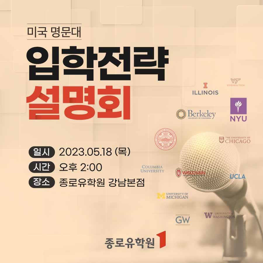 41년 전통의 유학전문기업 종로유학원에서 미국대학교 입학전략 설명회를 개최한다. 이 설명회는 5월18일 오후2시 종로유학원 강남본점에서 진행되며 미국명문대학교 입학을 준비하는 고등학교 2, 3학년 학생과 재수생, 내신성적이 낮아도 미국100위권 주립대학교 입학을 희망하는 학생 등 미국대학교 입학에 관심이 있는 학부모와 학생들이 참가 가능하다.