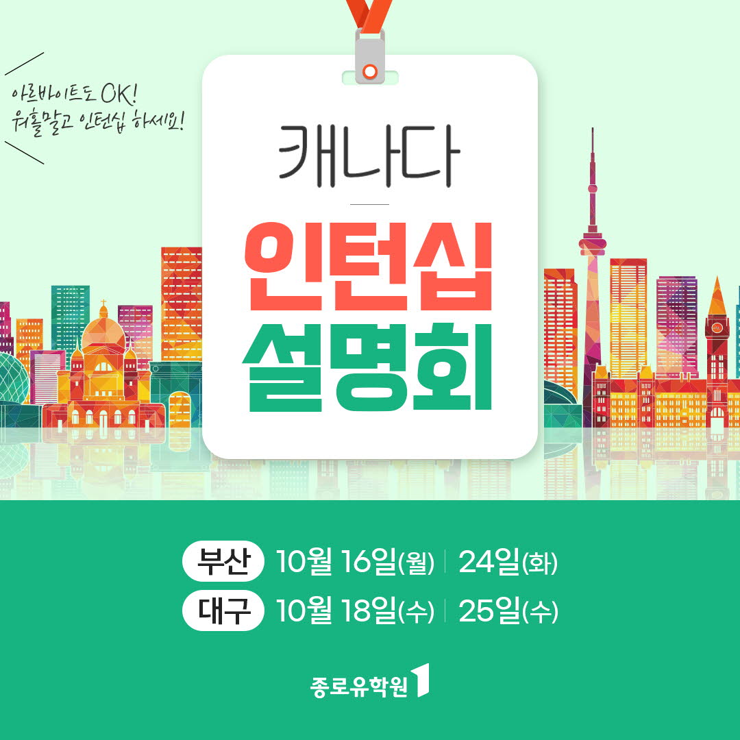 41년 전통의 유학 전문기업 종로유학원에서 부산과 대구에서 ‘캐나다 인턴십 설명회’ 개최한다. 설명회는 10월 16일(월)과 24일(화)은 부산에서 18일(수)과 25일(수)은 대구에서 각각 진행된다.