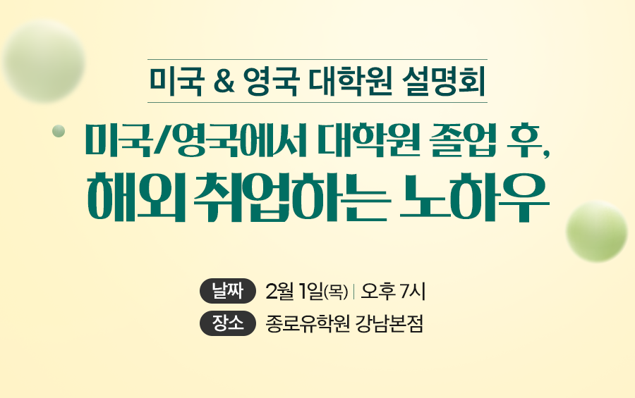42년 전통의 유학전문기업 종로유학원에서 ‘미국&영국 대학원 설명회’를 2월 1일 오후 7시에서울 강남 본점에서 진행할 예정이다. 이번 설명회는 해외 대학원을 고려중인 대학&대학원생, 취업 초년생으로 커리어 변경을 고려중인 분, 해외 취업을 희망하는 학생 및 직장인을 대상으로 정보를 제공한다.
