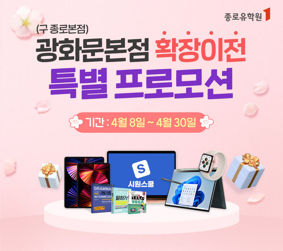 종로유학원 이번 광화문본점 확장 이전을 기념하여 4월말까지 특별 프로모션을 진행한다. 광화문본점을 방문 상담하는 모든 고객들에게는 기념품을 증정하고, 어학연수 고객 대상으로 장학혜택 외에도 4주 학비 지원도 이루어진다. 학위 유학, 조기 유학의 경우, 10~20%의 수속비 할인과 장학금 추가 혜택을 누릴 수 있는데, 이는 광화문본점만이 아닌 강남본점을 포함한 종로유학원 전국 지사에서 동일하게 혜택이 제공된다.