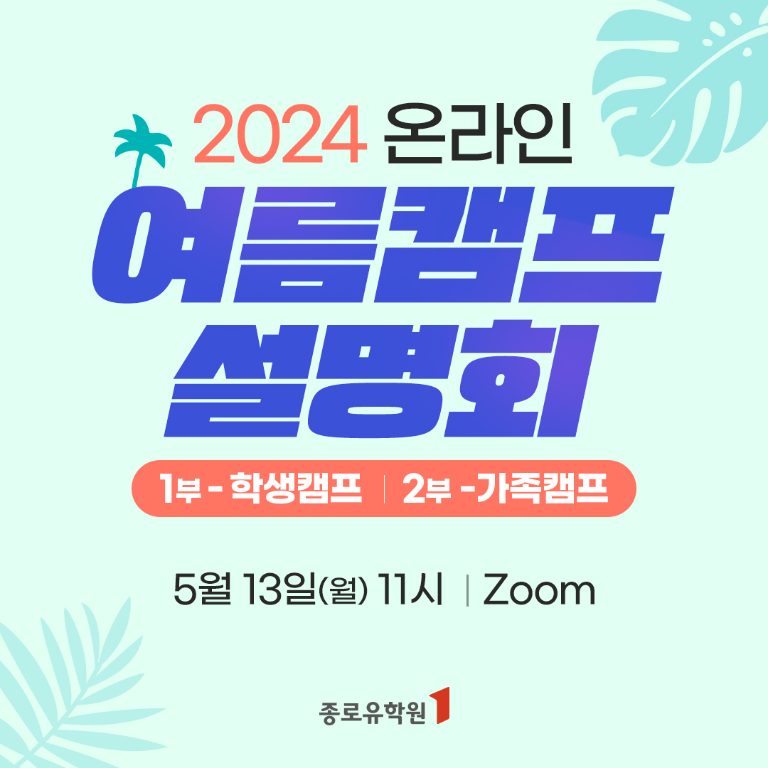 유학전문기업 종로유학원은 지난 4월 열린 설명회가 긍정적인 반응을 보인 것을 기념해 ‘2024 온라인 여름캠프설명회’를 다시 개최한다고 밝혔다.