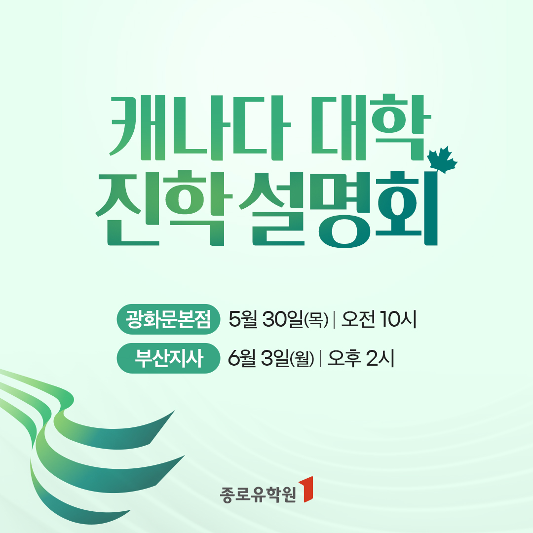 유학전문기업 종로유학원은 오는 5월 30일과 6월 3일, 서울과 부산에서 캐나다 대학 진학 설명회를 개최한다고 밝혔다.