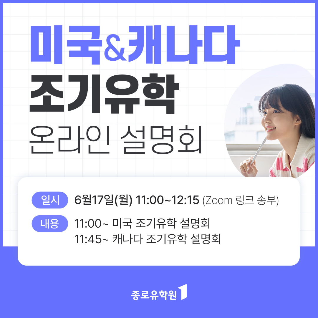 유학전문기업 종로유학원이 큰 성원에 힘입어 오는 6월 17일 미국, 캐나다 조기유학 온라인 설명회를 다시 한번 진행한다고 밝혔다. 집에서 편하게 Zoom링크 통해 접속 가능하며, 설명회 이후 20년이상 경력의 조기유학 전문가와 1:1 상담이 가능하다.