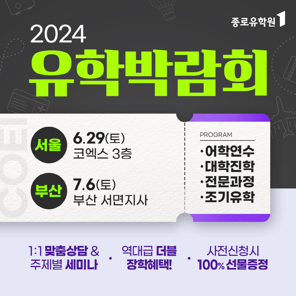 42년 전통의 유학 전문 기업 종로유학원이 2024년 6월 유학박람회를 오는 6월 29일 서울 코엑스와 7월 6일 부산 종로유학원에서 개최한다고 밝혔다. 올 여름 최대 규모의 유학박람회를 통해 세미나 참석으로 기초 정보 수집 및 전문가와 일대일 상담으로 유학 계획을 구체화할 수 있는 기회가 될 것으로 보인다.