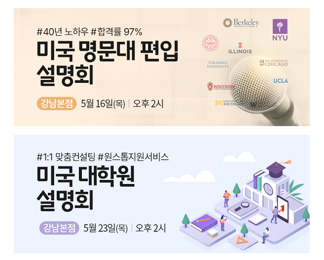 5월 16일 미국 명문대 편입 설명회는 한국 대학이나 캐나다, 홍콩 등 해외대학에서 편입할 경우는 물론, 미국 2년제 대학에서 4년제 또는 미국 4년제 대학에서 명문대로 편입할 경우나, 평생교육/학점 은행제에서 미국 대학으로 편입을 희망하는 대상으로 정보를 제공한다. 편입 지원 정보와 현실적인 편입 목표, 전공별 편입 준비, 편입 준비 시기 및 준비 사항 등 다수의 우수한 대학으로 편입한 사례도 생생하게 들을 수 있다.