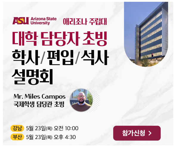 유학전문기업 종로유학원이 오는 5월 23일 강남본점과 부산지사에서 미국 애리조나 주립대학교(Arizona State University)의 국제학생 담당관(Miles Campos)과 함께 설명회를 진행한다고 밝혔다.