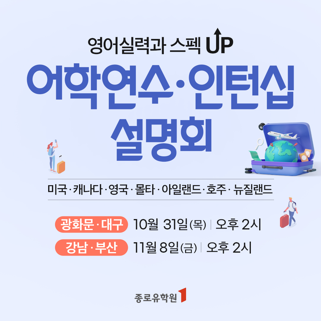 [메가경제=양대선 기자] 종로유학원이 ‘어학연수 & 인턴십 설명회’를 오는 10월 31일 오후 2시 광화문본점(서울 파이낸스 센터)와 대구지사, 11월 8일 오후 2시 강남본점과 부산지사에서 각각 진행한다고 밝혔다.