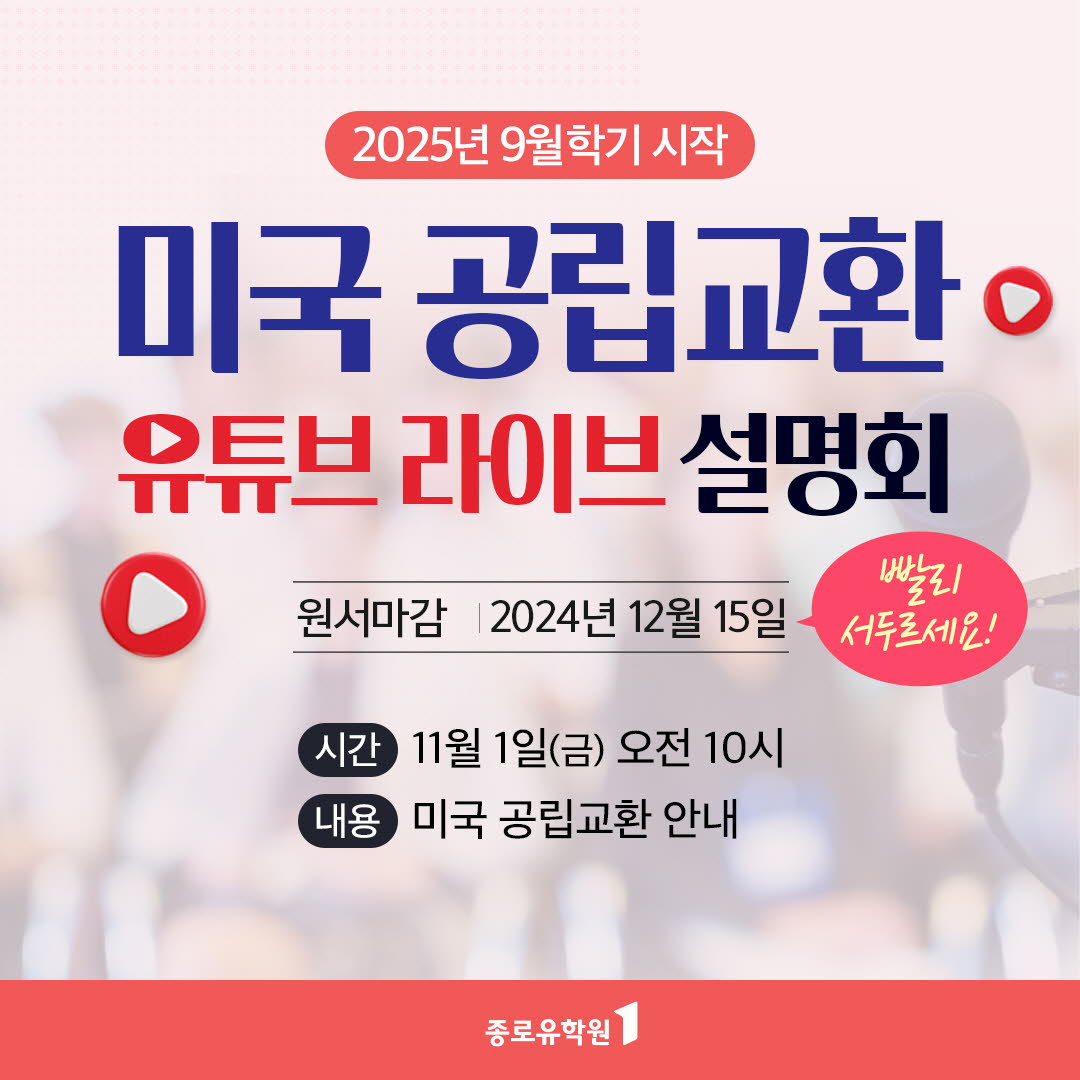 [메가경제=양대선 기자] 유학전문 기업 종로유학원이 2025년 9월 학기 시작 미국 공립교환 유튜브 라이브 설명회를 진행한다고 23일 밝혔다.