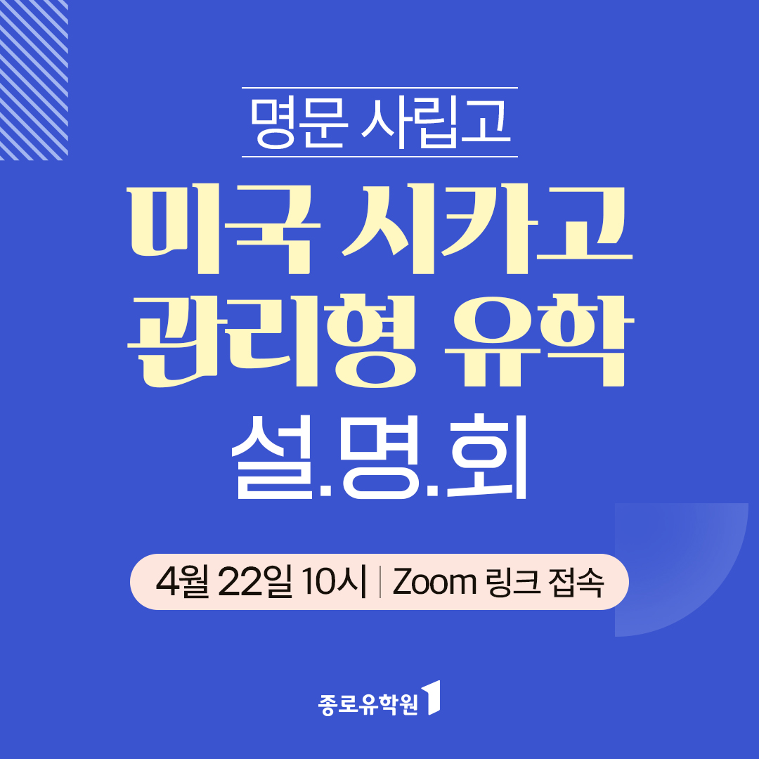 [잡포스트] 김진호 기자 = 43년 전통 유학 전문 기업 종로유학원에서 조기유학생을 대상으로 한 ‘미국 시카고 기숙사 관리형 유학 설명회’를 오는 4월 22일 화요일 오전 10시에 온라인 zoom으로 진행될 예정이다.