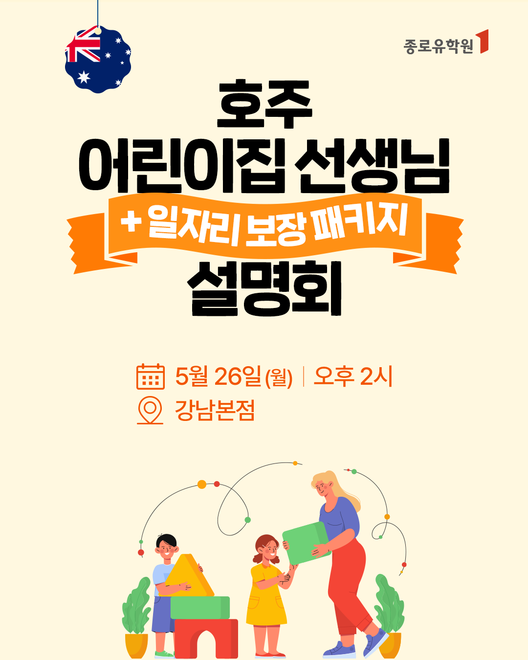 유학 전문 기업 종로유학원이 오는 5월 26일(일) 오후 2시, 서울 강남 본점에서 ‘호주 차일드케어 일자리 보장 패키지’ 설명회를 개최한다고 밝혔다. 이번 설명회는 호주 어린이집 교사 과정을 통한 유학 및 취업 연계에 관심 있는 이들을 대상으로 진행된다.