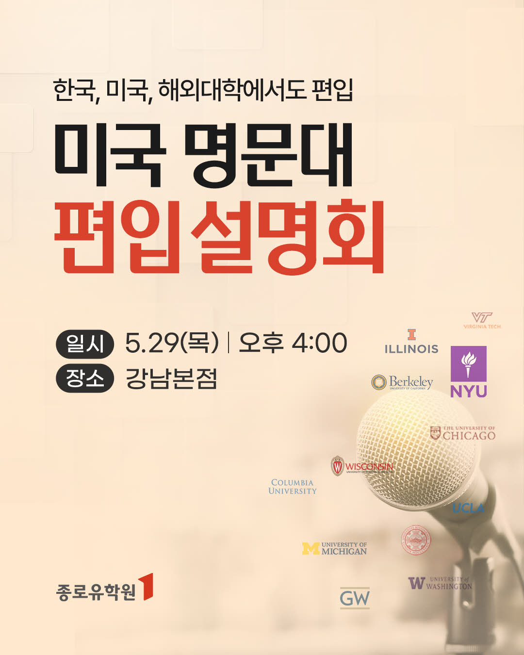 이번 설명회는 사전 예약제로 진행되며 종로유학원 공식 홈페이지를 통해 신청이 가능하다.