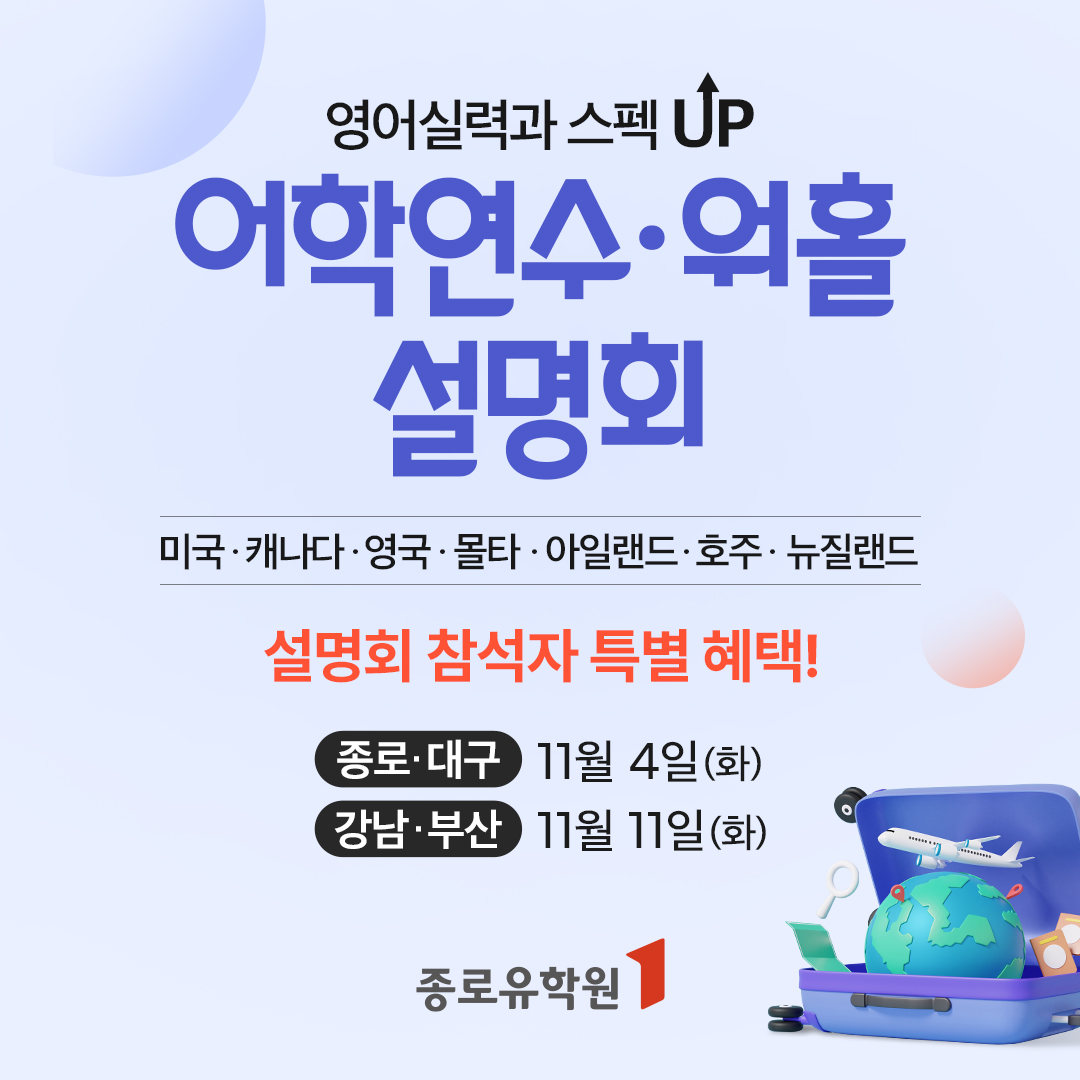 [메가경제=양대선 기자] 유학전문기업 종로유학원이 ‘어학연수 & 워홀 설명회’를 오는 11월 4일 종로와 대구지사, 11월 11일 강남과 부산에서 각각 진행한다고 23일 밝혔다.영어 실력 향상뿐만 아니라 다양한 이유와 목표를 갖고 많은 사람들이 어학연수를 선택하고 있다. 더불어 워홀에 대한 수요도 증가하는 추세이다. 어학연수는 미국, 캐나다, 영국, 호주, 몰타 등 선택지가 다양한데 국가별 분위기와 특징, 비용이 다르기 때문에 다방면으로 비교해 본 뒤 준비해야 한다.