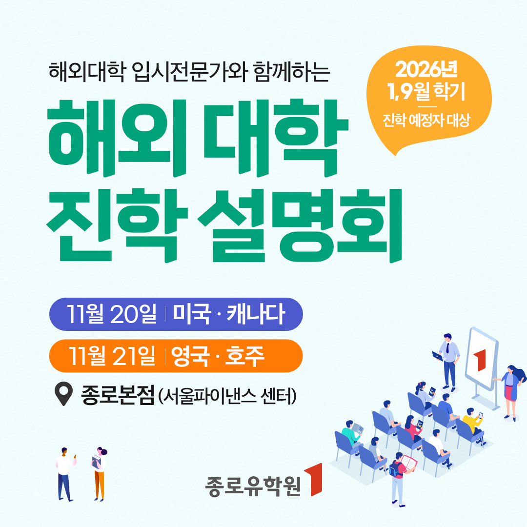 [잡포스트] 최혜진 기자 = 유학전문 기업 종로유학원은 곧 치러질 대학수학능력시험을 앞두고 해외대학 진학에 대한 관심이 높아짐에 따라, 11월 20일(목)~21일(금) 양일간 서울 중구 파이낸스 센터에 위치한 종로유학원 종로본점에서 해외대학 진학 설명회를 개최한다고 밝혔다.