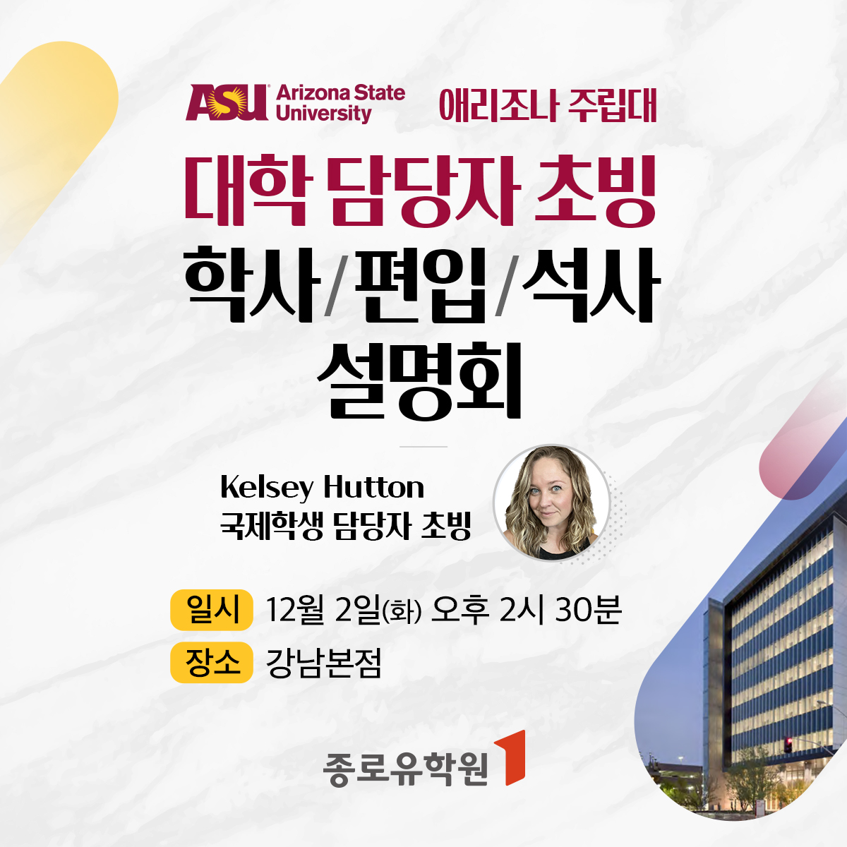 [잡포스트] 김진호 기자 = 유학전문기업 종로유학원이 오는 12월 2일 강남본점에서 미국 애리조나 주립대학교(Arizona State University)의 국제학생 담당관(Kelsey Hutton)과 함께 설명회를 진행한다고 밝혔다.