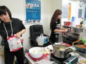 땀 뻘뻘^^;; 흘리며 파전 부치는 홍수민, 이종하학생                 회원분들은 담소중...!