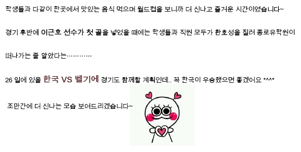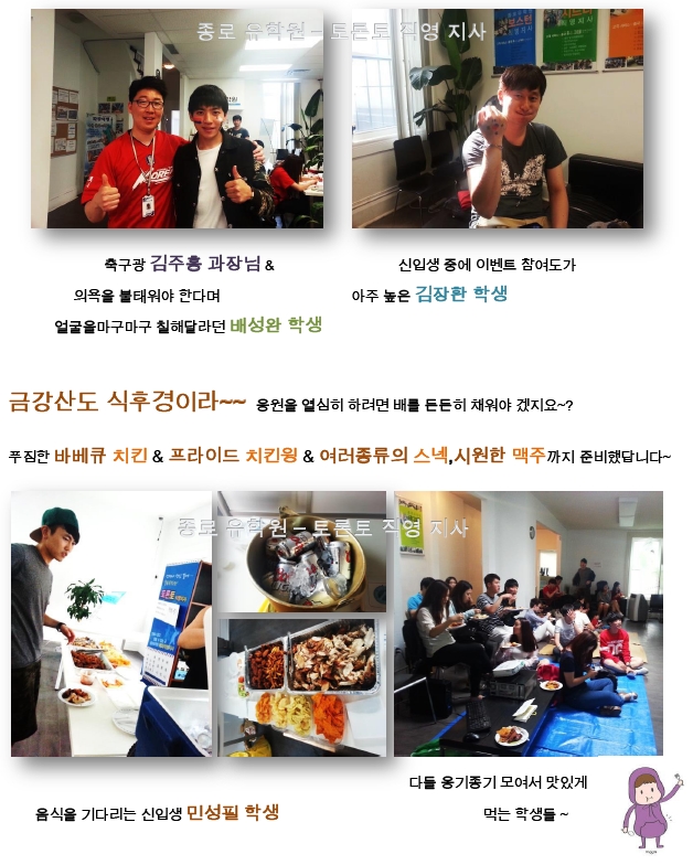 안녕하세요~~ 토론토는 이제서야 초여름이 시작되었습니다 ! 덥고 습하고 지치지만! 기다리고 기다리던 6월 17일 한국 VS 러시아 월드컵 경기가 있었죠 ?? 대~~~한민국 짝!짝!짝!짝짝~~ 저희 토론토 지사에서는 학생들과 함께 지사에 모여서 (응원에 빠질 수 없는..) 맛있는 치맥을 먹고 마시며 신나게 응원했답니다~~