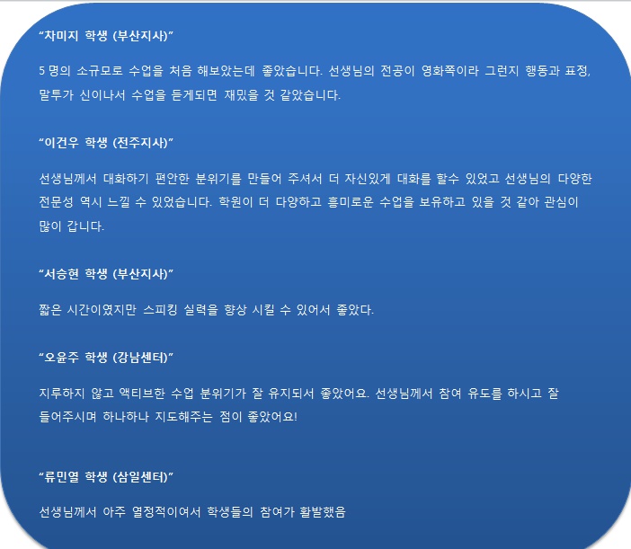아래는 파워스피킹 데모 수업을 들은 학생들의 후기 입니다.