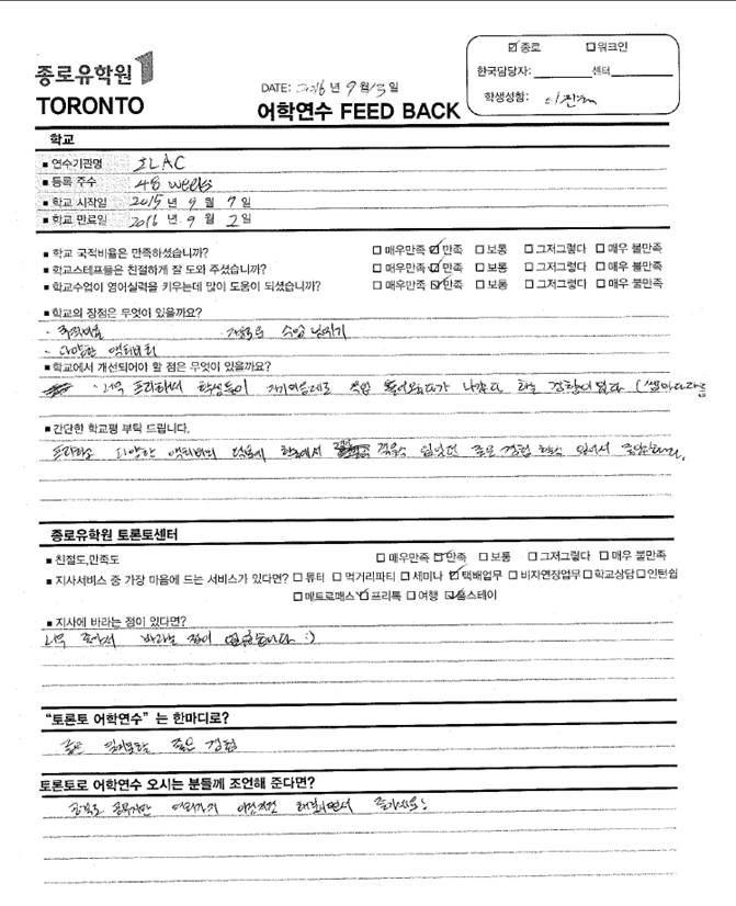 2015년 9월 7일에 입국하여 ILAC-TORONTO에 48주 다니신 이*태 학생의 어학원 및 종로토론토센터 피드백 입니다.