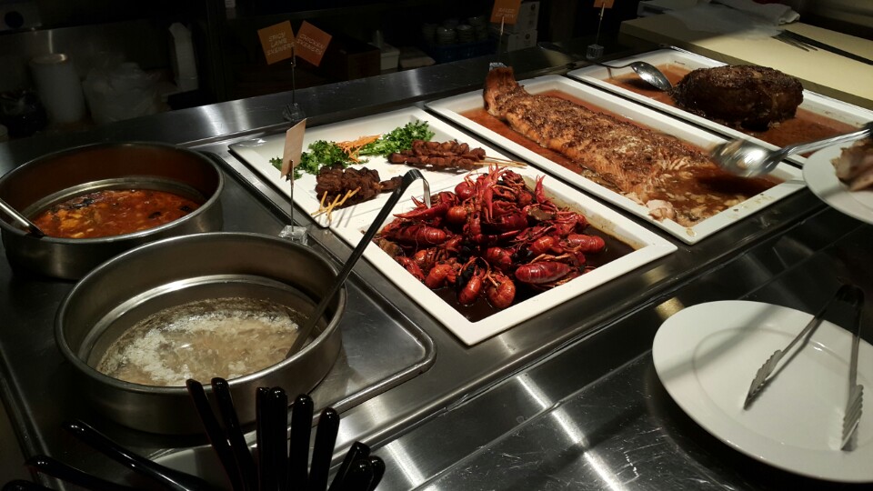 여기는 자유롭게 먹을 수 있는 연어훈제, 고기 그리고 해산물 등도 있어요.