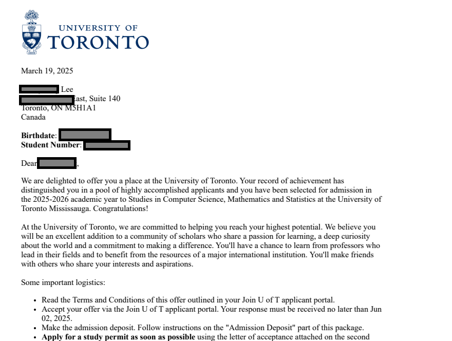 QS 세계대학 전산학 분야 Top 10에 빛나는 University of Toronto의 Computer Science 전공에 합격한 학생의 우수한 성과입니다.