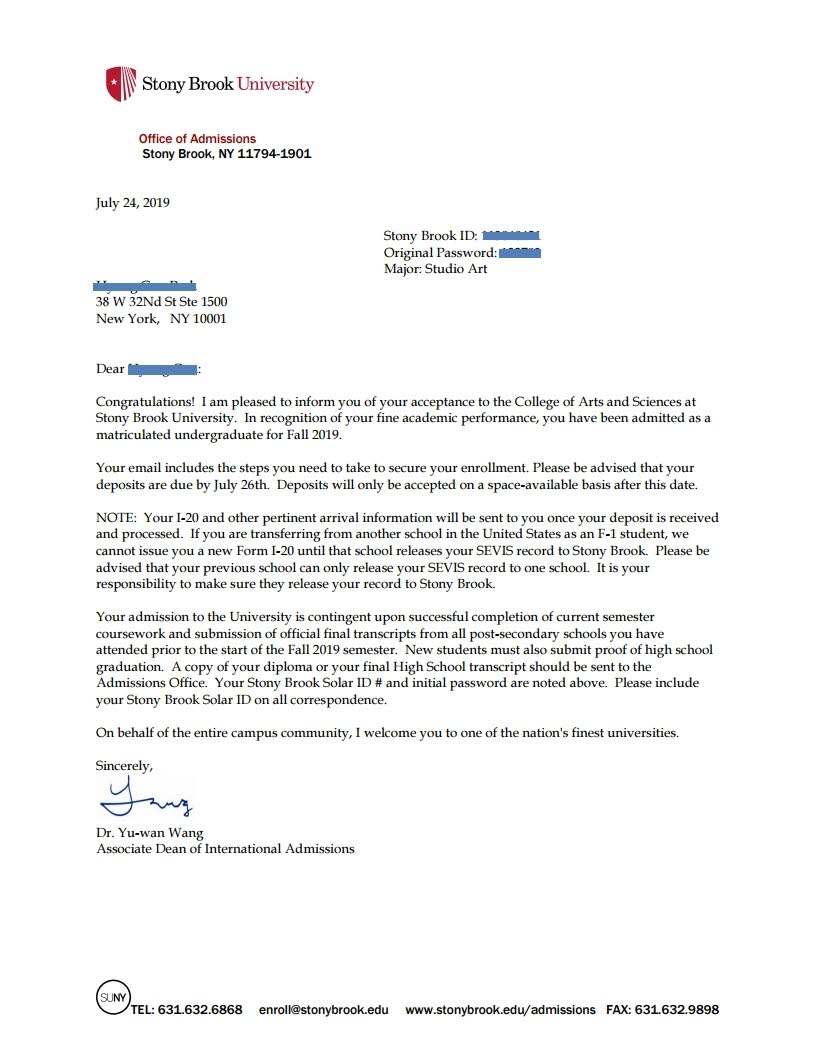 Stony Brook University 의 Studio Art 전공으로 2019년 가을 학기에 합격 하였습니다!