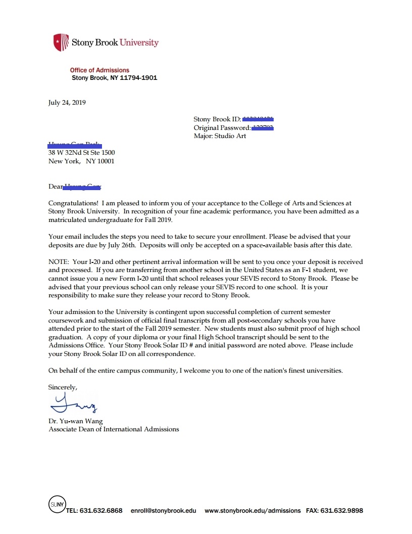Stony Brook University의 Cinema 전공으로 2019년 가을 학기에 합격 하였습니다!