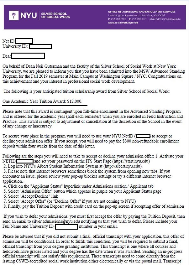합격을 축하드립니다. New York University 의 Master of Social Work 합격을 축하드립니다. 연간 $12,000 의 장학금도 함께 받게 되었습니다!!