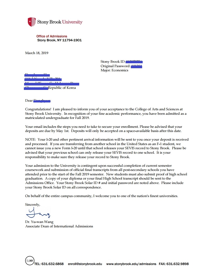 Stony Brook University의 Economics전공으로 2019년 가을 학기에 합격 하였습니다!