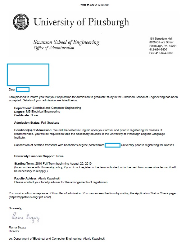 합격을 축하드립니다! University of Pittsburgh 의 MS in Electrical Engineering 가을학기에 합격하였습니다~