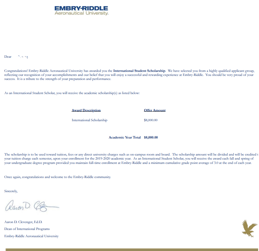 합격을 축하 드립니다~! ^^ ‘하늘의 하버드’ 로 불리는 엠브리리들 대학 항공조종학과 신입학에 합격하였습니다. 2019년 가을학기로 지원하였으며 좋은 내신성적으로 장학금 $8,000 도 받았습니다!!!