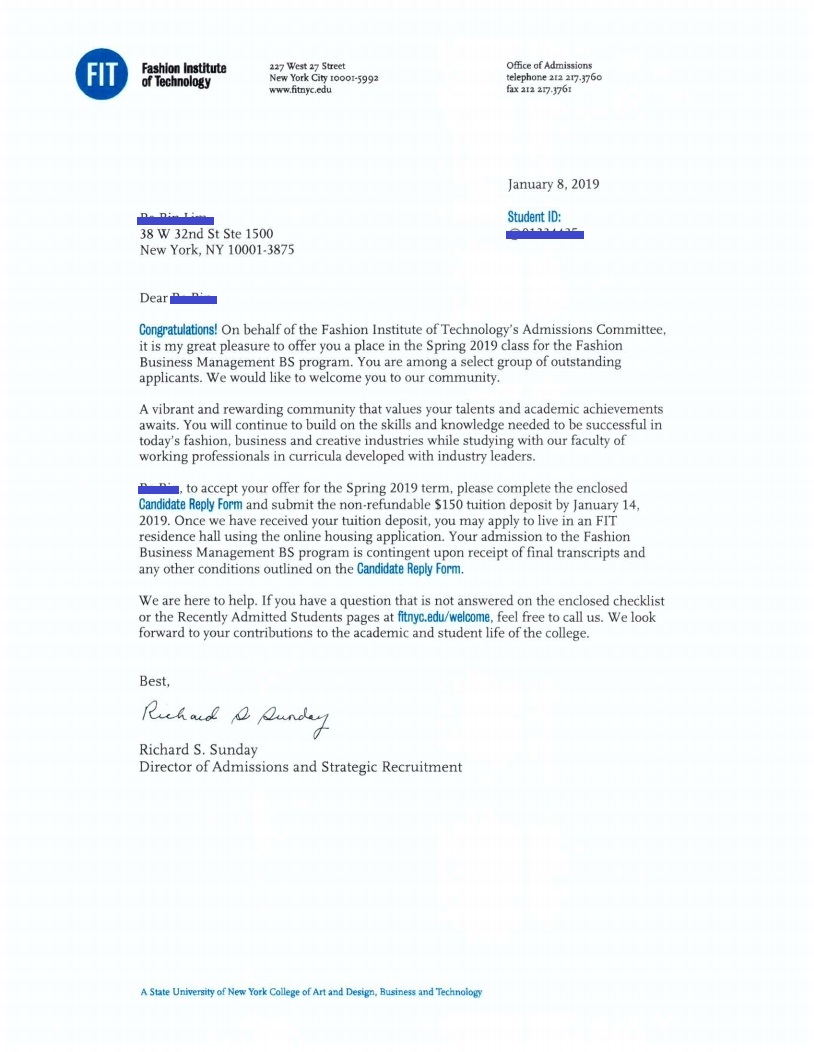 합격을 축하 드립니다! Fashion Business Management 전공으로 2019년 봄 학기에 합격 하였습니다.