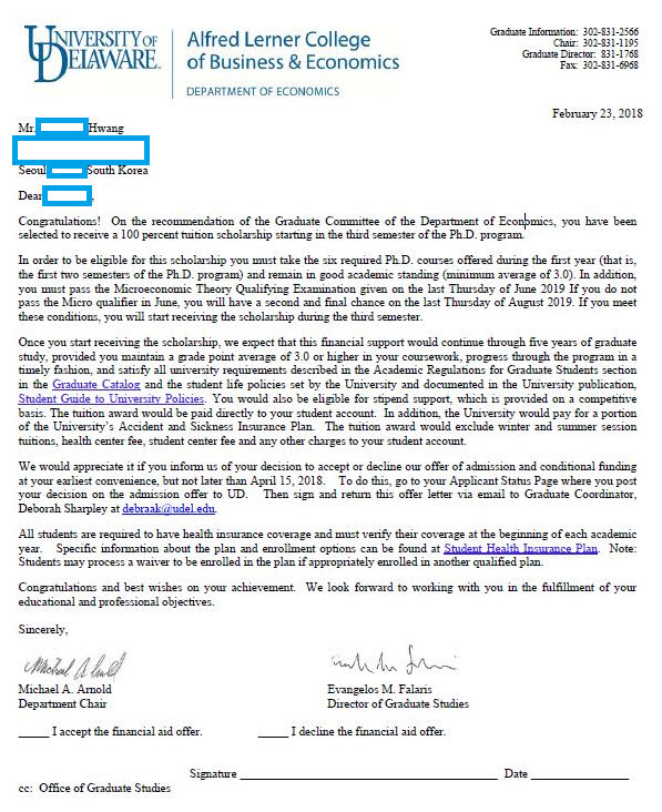 합격을 축하드립니다! 지원했던 대학 중 가장 먼저 합격소식을 들었던 대학입니다. 안정권으로 지원했던 학교 중 하나였는데요 3번째 학기부터는 100% 장학금을 받는 조건으로 허가서를 받았습니다.