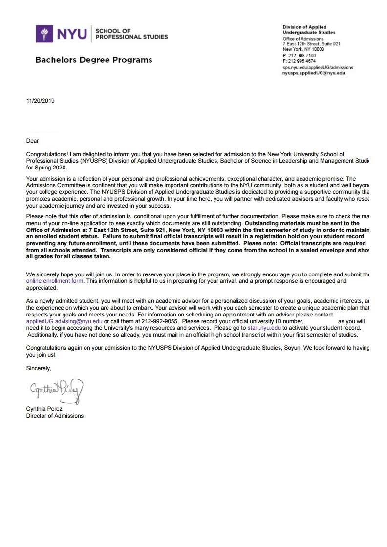 New York University 의 Leadership and Management 전공으로 2020년 봄 학기에 합격 하였습니다!