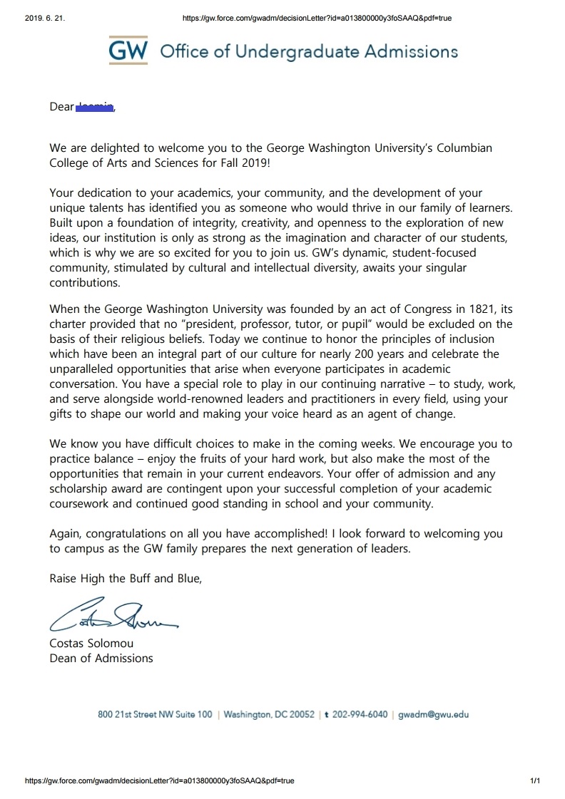 George Washington University의 Economics전공으로 2019년 가을 학기에 합격 하였습니다!