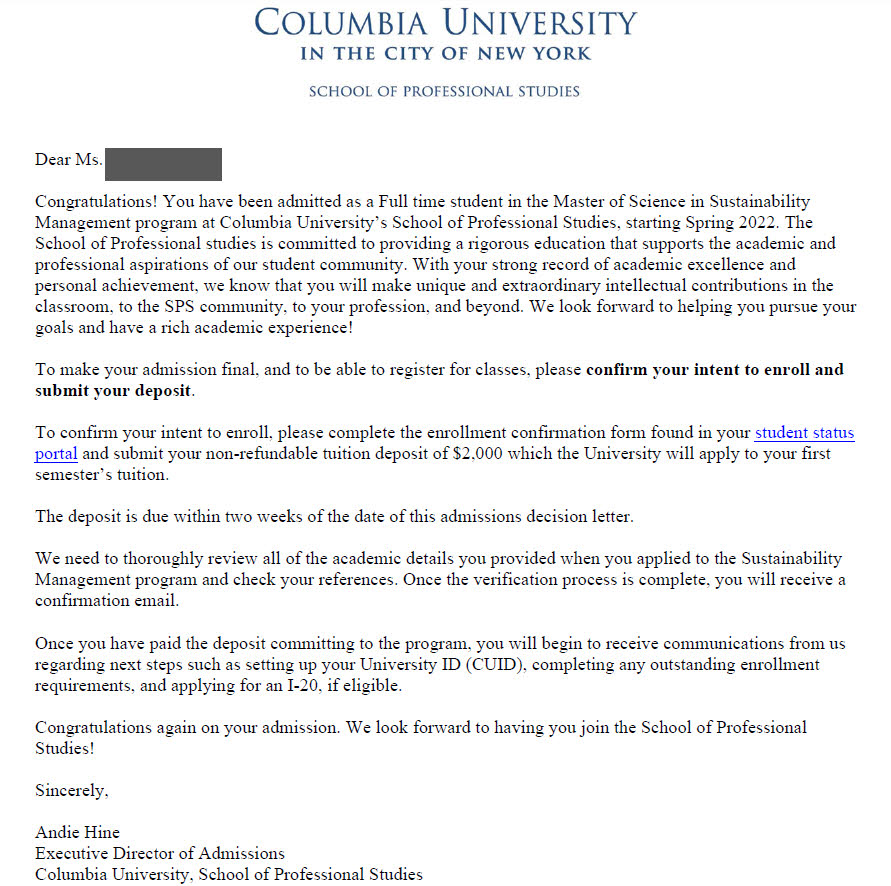 아이리비리그에 속한 명문대학인 Columbia University 에 합격하였습니다. 합격을 진심으로 축하드립니다.!!
